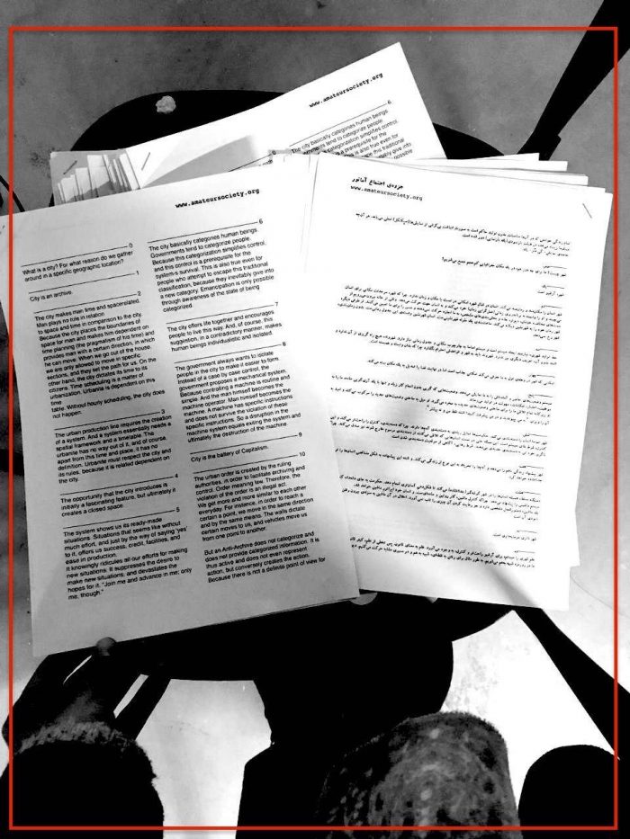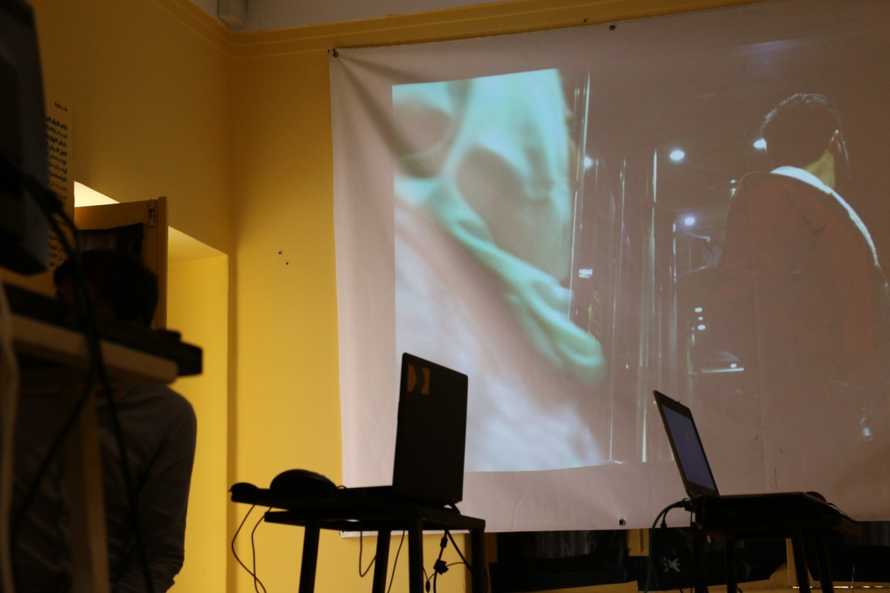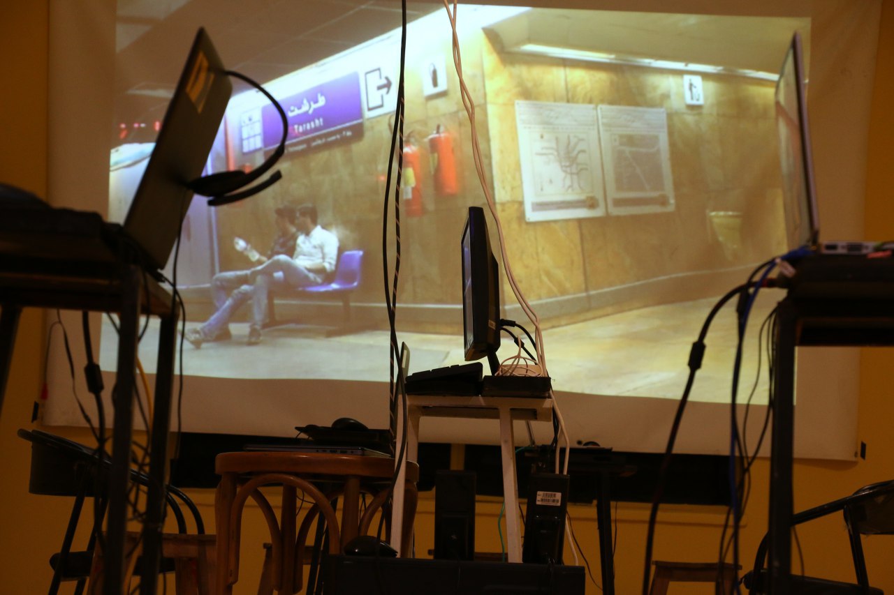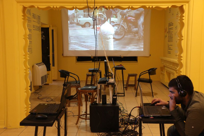 Gallery no.1 was painted all in yellow and there were texts all around written with stencil and spray. They contained descriptions of space features, leaflet of Amateur Society theory, control, montage and hacking. (The texts are available on the website.) In the center of the space there was the server computer which had the Tehran archive on it. This archive contains films of Tehran recorded by Amatuer Society from 2016. There were 4 other computers connected to the server by cables. People could sit at them, watch the films, add their files and make their own films with the help of a simple editing program (which had a tutorial on the system).
